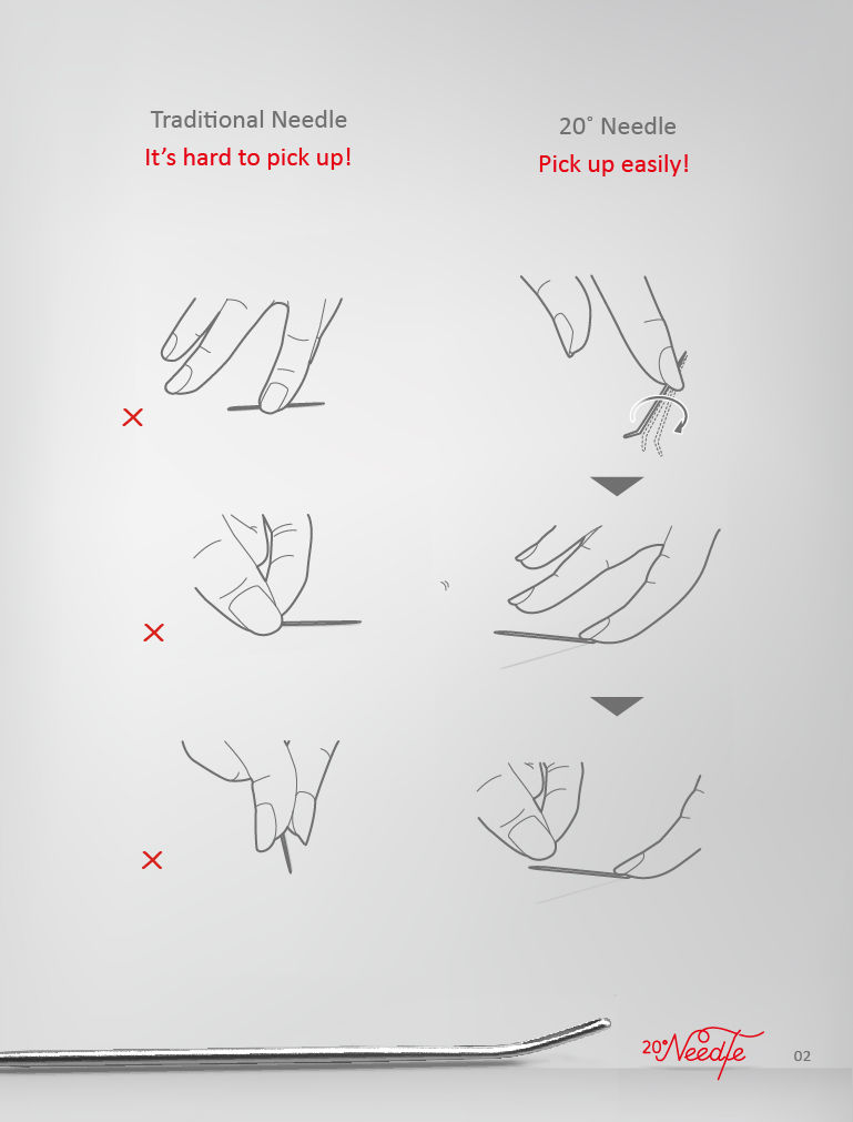Traditional needles are difficult to pick up. 20° needle is a needle with bending that helps you easily to pick up.